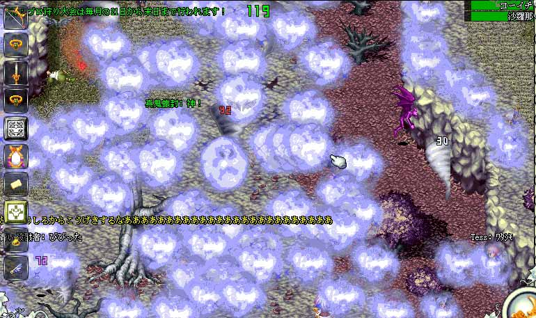 ハリケーンかな?全体ダラー打ってきます。これで1画面分なんだけどさ。この魔法が炸裂してるところは全部プレイヤーなのね。こんな感じでセル南が人で一杯になってて、あーまだこんなにエラやってる人いたんだぁ、ってちょっとおセンチになっちゃいましたよ。結構ミッドナイトだったんだけどね。